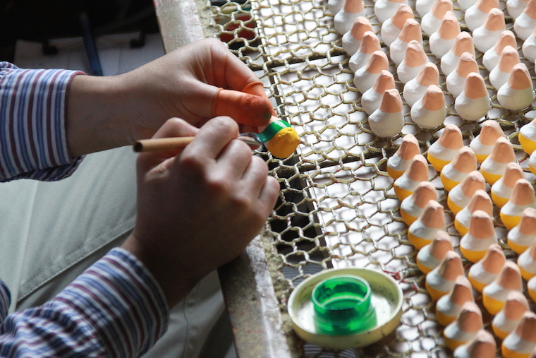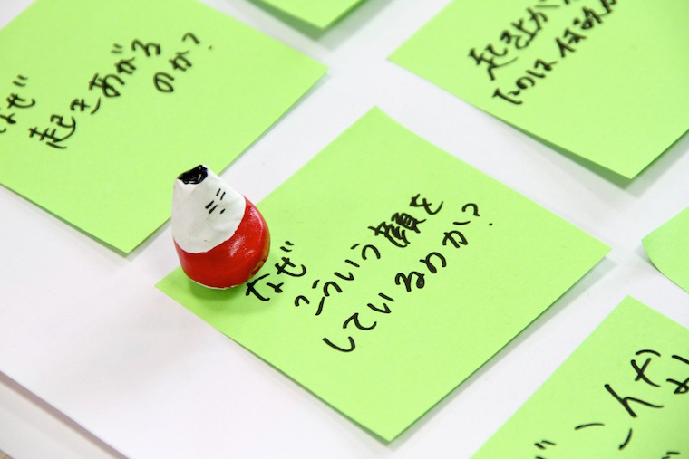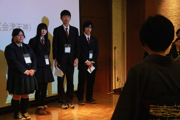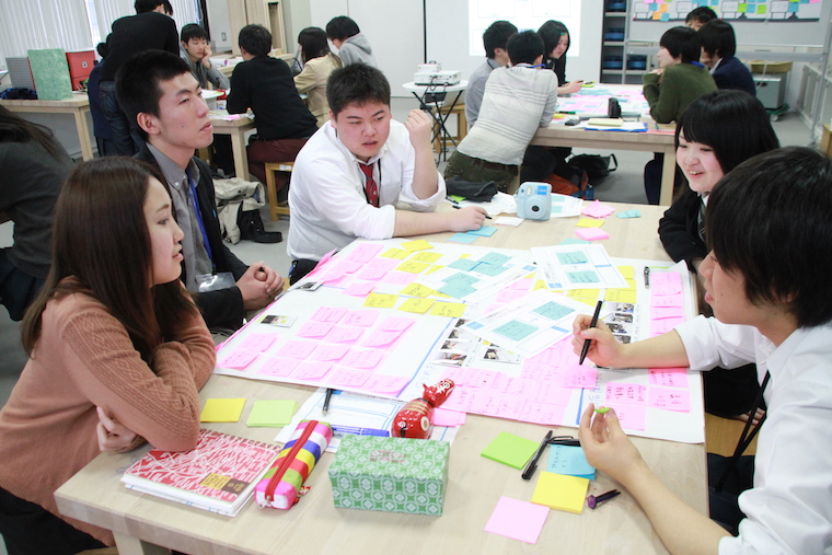 会津で起き上がり小法師を唯一手作りで守り続けているのが山田民芸工房です。ここに訪れた高校生たちは、作られている起き上がり小法師が手作りのために、一つとして同じ形がないことに初めて気づき、それこそが魅力と考えました。そして、アイデアとしては、起き上がり小法師のオリジナリティが人々にもっと知られるための様々な仕掛け作りを考え、発表しました。