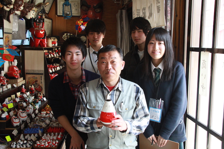 赤べこ、起き上がり小法師、会津天神、絵ろうそく。会津の人々にとってはお家に飾られるなど、身近に必ずあるものが民芸品です。たとえば、起き上がり小法師は、会津の民芸品の中でも最も古く、約400年前から作られてきたとも言われています。お正月の縁起物であり、1月10日の初市「十日市」で家族の人数より一つ多く買い求め、「転んでも転んでも起き上がる」というところから、一族繁栄や家内安全を祈り、一年中神棚に飾るという風習もあります。しかしながら、民芸品は身近なものであるが上に、特に若者にとっては、民芸品に対しての興味・関心が薄れ、その魅力も見過ごされています。地域の高校生たちは、会津の民芸品をつくる職人にインタビューを行うことで、民芸品がもつ魅力を探求し、それを未来につなげるためのアイデアをつくることに挑みました。